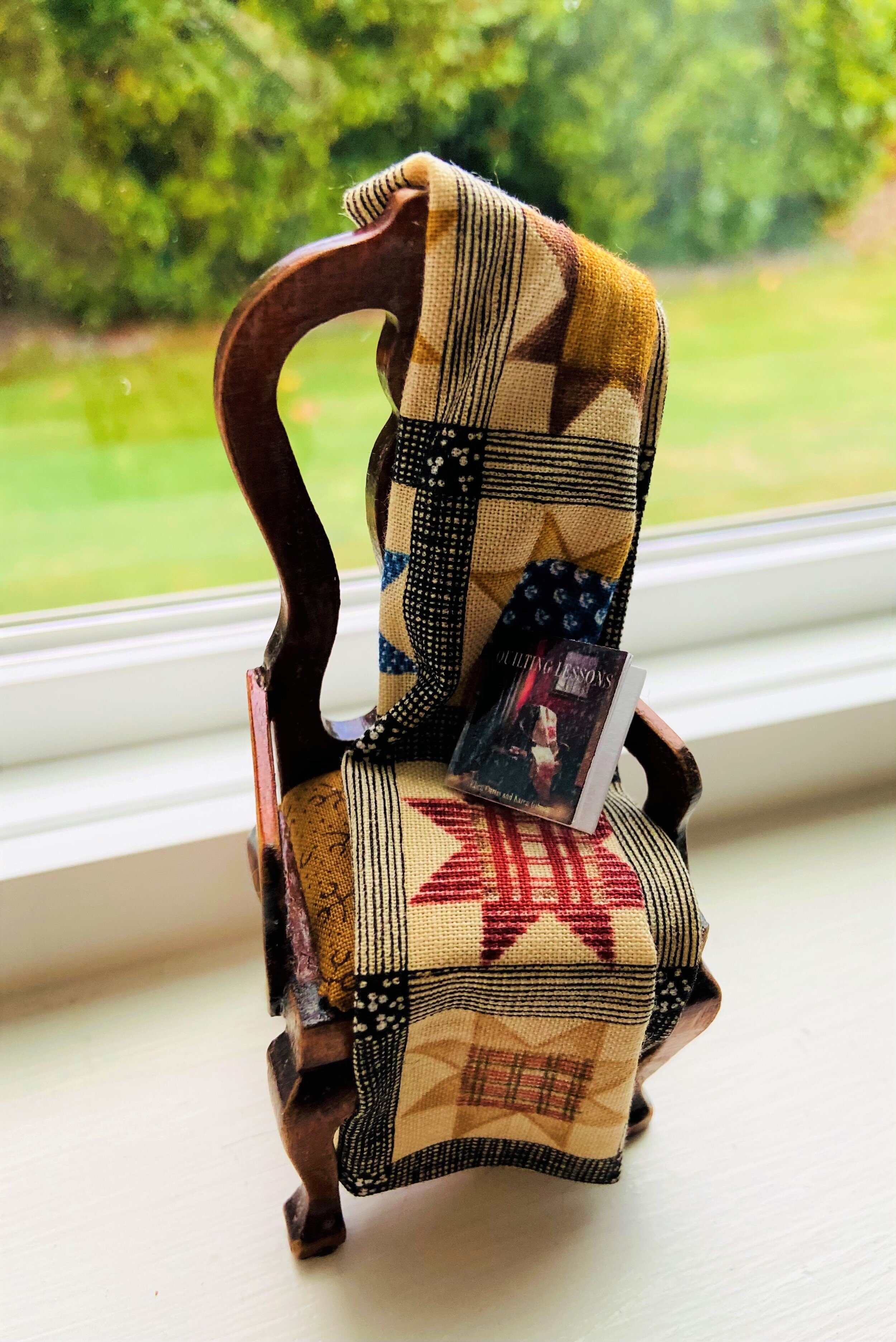 In addition, we have been surprised by the generosity of our readers: We have received quilt squares and small quilts made for us. In the accompanying photo a talented miniaturist, Dorothy, created a replica of the chair from our front cover with a copy of our devotional on it.